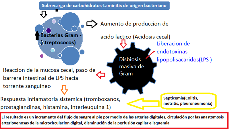 Ilustración de las teorías para la aparición de laminitis en equinos por sobrecarga de carbohidratos y laminitis asociada a la sepsis.
