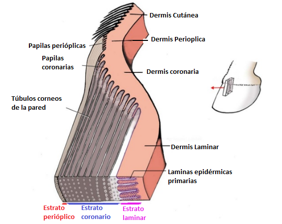 Desde la superficie a la profundidad, en el pie se pueden encontrar los estractos tectorial (externo), medio y laminar(interno), para luego hallar el corion, el periostio y la falange distal. El área de especial importancia en la laminitis es el estrato laminar, que contiene las láminas y la división entre la epidermis y la dermis. Las láminas están constituidas por laminas epidérmicas primarias cornificadas (extensiones de la epidermis ) y las correspondientes laminas dérmicas primarias no cornificadas del corion (extensiones de la dermis). Cada lamina primaria contiene muchas otras secundarias cuya interdigitación provee la fuerza necesaria para soportar la falange distal dentro del casco. Medicina y Cirugía Equina